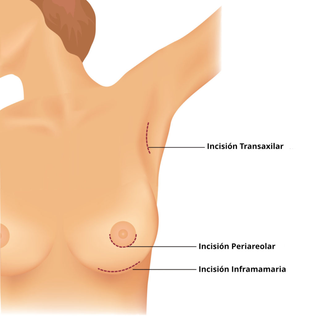La incisión se diseña para que la cicatriz resultante sea casi invisible. A través de esta incisión se levanta el tejido mamario, se crea un bolsillo y se coloca la prótesis, directamente debajo del tejido mamario o debajo del músculo pectoral.