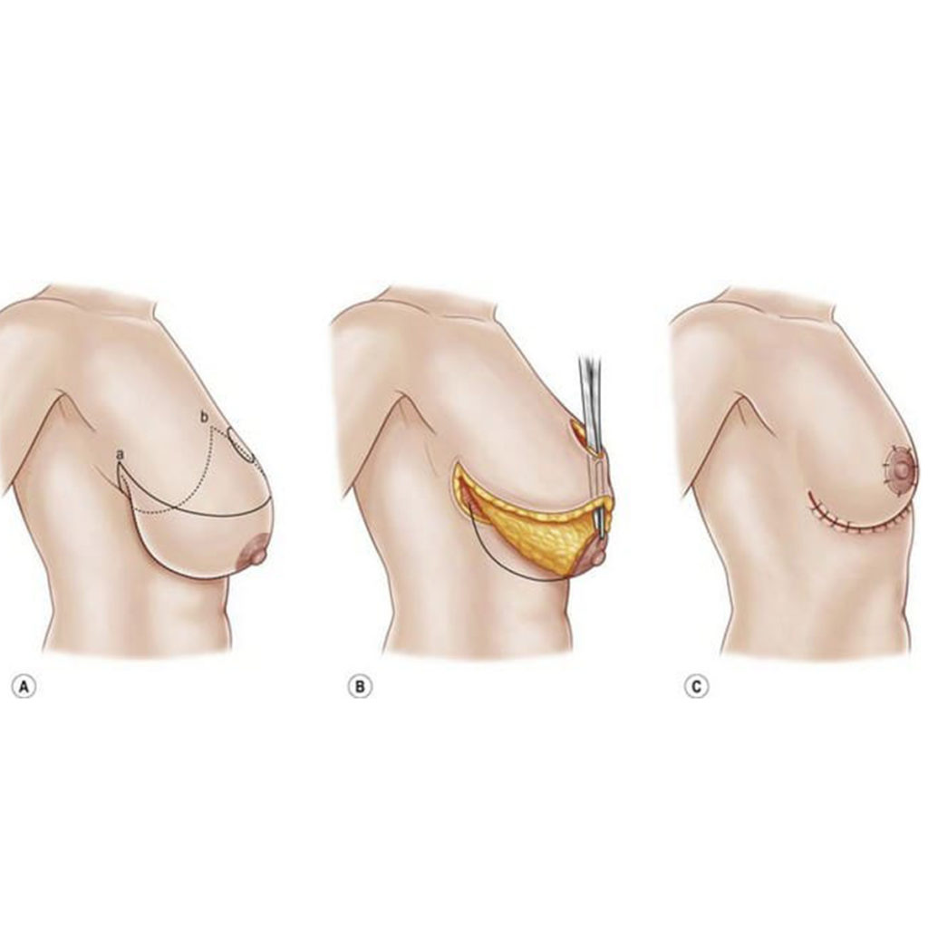 En estos casos la resección de tejidos es mínima, ya que se aprovechan -a veces con la ayuda de una prótesis- para darle volumen y proyección adecuada a la mama, una vez que esta se ha remodelado en su posición ideal.